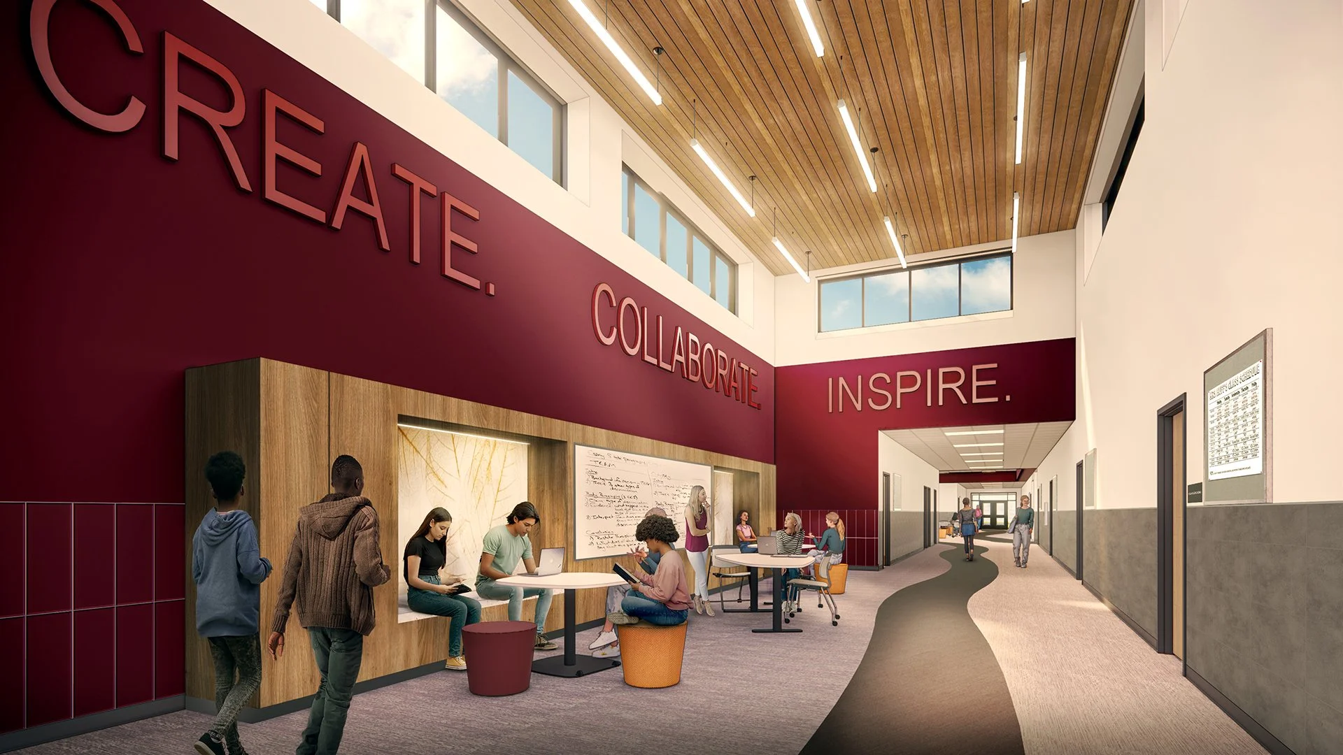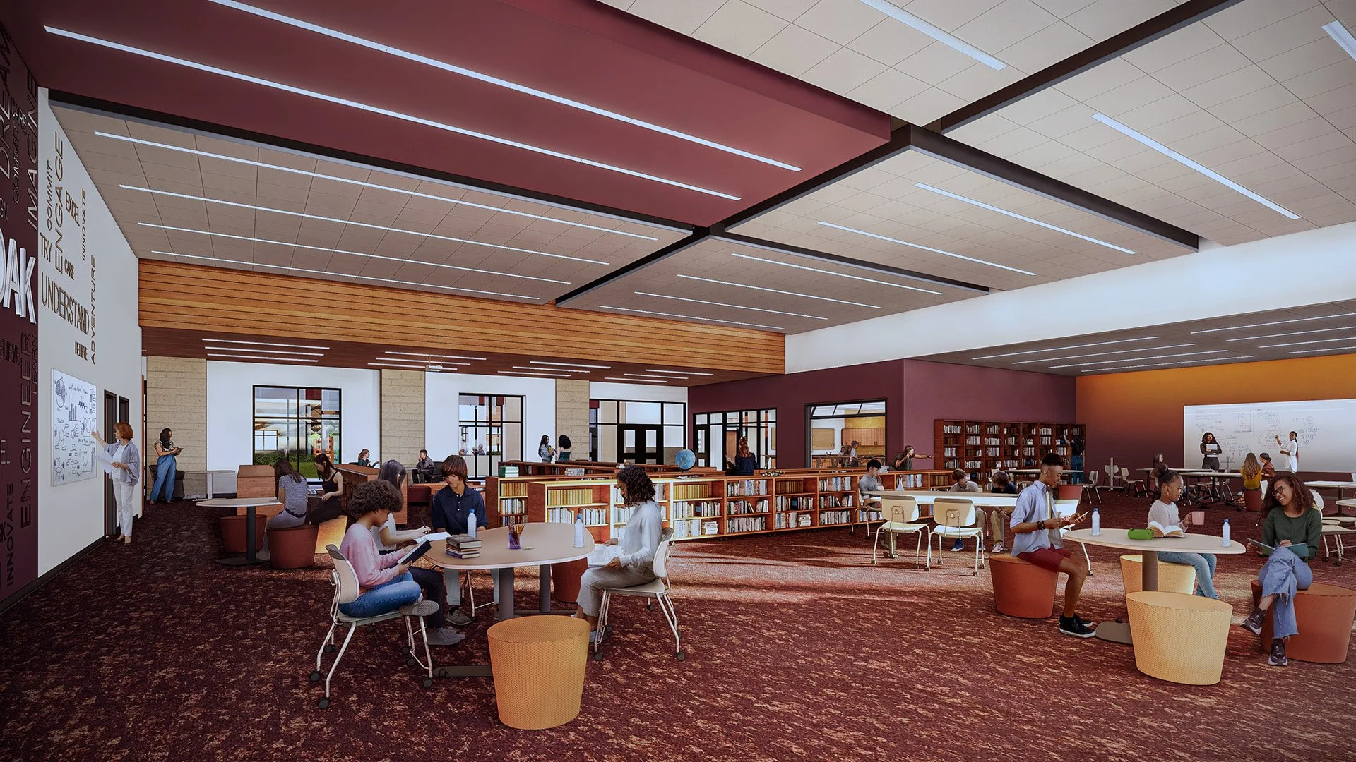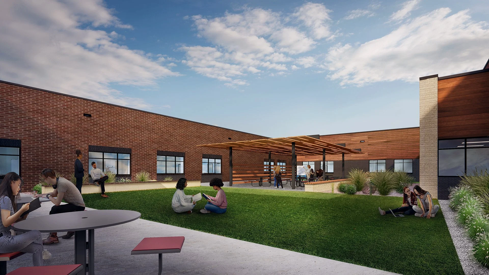The school layout will house academics on one half of the campus and electives and extra-curricular activities on the other side, allowing for a quiet and less quiet concept. Three academic wings will include three interior courtyards for outdoor learning. The cafetorium and library design is flexible for both daily functions and evening activities. The school’s main gym will serve as the required storm shelter and outdoor PE and athletics will include tennis courts and a multi-sport field with a track.